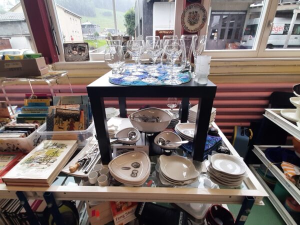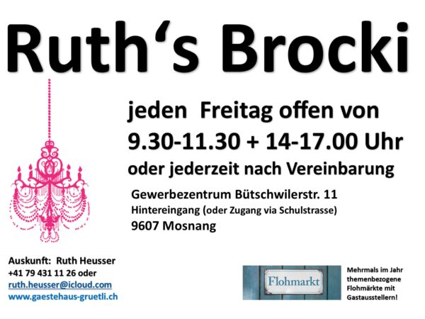 Ruth’s Brocki in Mosnang, klein aber fein! Zugegeben, unser Brocki gehört mit knapp 100m² zu den kleineren Geschäften. Auf dieser Fläche finden Sie aber eine Riesenauswahl an Geschirr Kleidern, Sportartikeln, Kleinmöbeln, Antiquitäten und vieles mehr